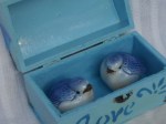 This craft all began with the fact that my friend is getting married and the theme for her wedding is blue birds. It certainly is a lovely wedding theme as blue birds mate for life. I found part of her gift right away, by walking into the tea room/gift shop in Morrisburg, called “The Basket Case”. It was there that I discovered the first part of her gift -a perky little pair of blue bird salt and pepper shakers. I was thrilled with my purchase, but I wanted the gift to be extra special so I decided to make a decorated container for the pair. I found an unpainted wooden chest-shaped box at the dollar store and planned how to transform it.