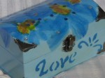 I decided to paint the box a pretty sky blue with acrylic paints. Once it was painted inside and out, my husband sprayed it with acrylic glaze. Then I lined the inside bottom with soft blue felt which I glued in place and trimmed with scissors. I wasn’t sure what I would use to decoupage the top until I remembered that I had some pretty blue flowered paper napkins. I first of all separated the two layers of napkins and then I cut carefully around the flowers. I then covered the top of the box with white glue (I will probably use less glue in future projects). I placed the cut out flowers on the glue in a pleasing pattern. After the glue dried I placed a number of blue and silver sequins on the box top as well with glue (I restrained myself from adding more than about ten). My next step was to add Mod Podge by brush all over the paper flowers and sequins. I did about three coats, drying each coat carefully before adding the next. I stenciled “love” in a darker blue on the front and covered it with Mod Podge too. The final step was spraying acrylic glaze over it all again and putting the blue felt on the bottom of the box to protect any table it is put on. Altogether, I was very pleased with the results, although I need more practice in stencils.