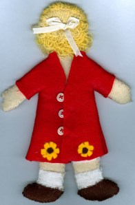 I chose red felt for the dress and cut out a piece for the front and two for the back.  I sewed up the sides and shoulders, slipped the doll into it and then made elastic button loops on one side of the dress back and sewed small white buttons on the other.  Yellow felt flowers with dark brown centers provided the decoration.  I sewed them on.  I plan to make another doll for our other granddaughter and hopefully make each doll two dresses.  The next project afterwards is to make a boy doll.  I’m having such fun making these dolls.  I’m thinking of making them fold-up dolls houses out of felt. foam and cardboard.  We shall see how ambitious I feel as it gets closer to Christmas.