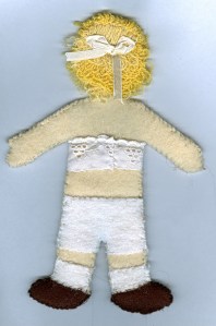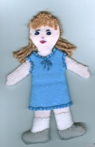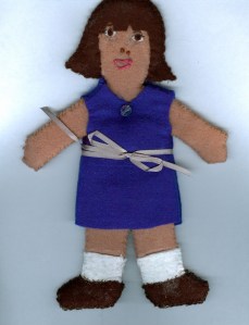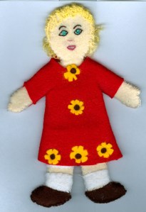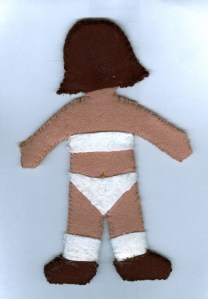 Then I thought I might do the same sort of thing for our foster child in Africa.  I thought foam would be light enough to send in an envelope.  This time I decided to cover the foam with some felt – a warm light brown.  I cut out two pieces of felt to cover the front and back of the doll.  I glued them on to the foam with white glue and then I thought I should make it even more secure by stitching the felt to the foam.  To dress the doll, I got out my felt scraps and glued, then sewed on the panties, halter top, socks and shoes.  I then embroidered on her face.  The hair posed a problem, but I solved it by cutting out a  black felt pattern and attaching it to the front and back of the figure.  To make her dress, I just traced around her, allowing some extra for a small seam and sewed the dress by hand as neatly as I could (sewing machines would be easier).  I think it turned out okay.
