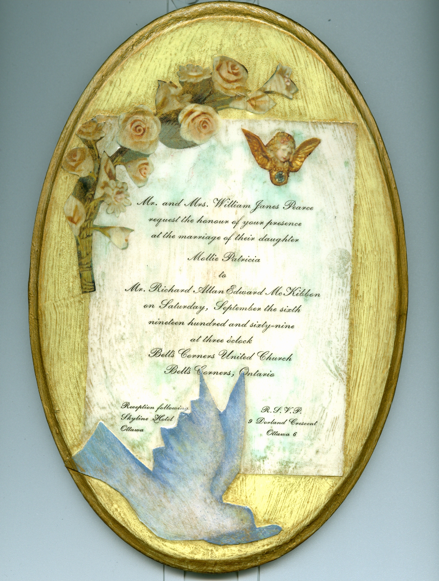 I decided to make my wedding dress because I thought spending several hundred dollars for a dress I would only wear once was just too wasteful. I thought perhaps that all those years in Home Economics should may be put to good use (I’d think twice now). My material plus the trims, thread and zipper came to about $90. I bought cotton eyelet and lined it with satin. I’d forgotten until yesterday, just how heavy that was. I made my sister’s gown too as she was going to be my maid of honour and my friend’s mom made hers. The girls wore flocked turquoise organdy (same pattern as my gown) with white velvet ribbon belts.